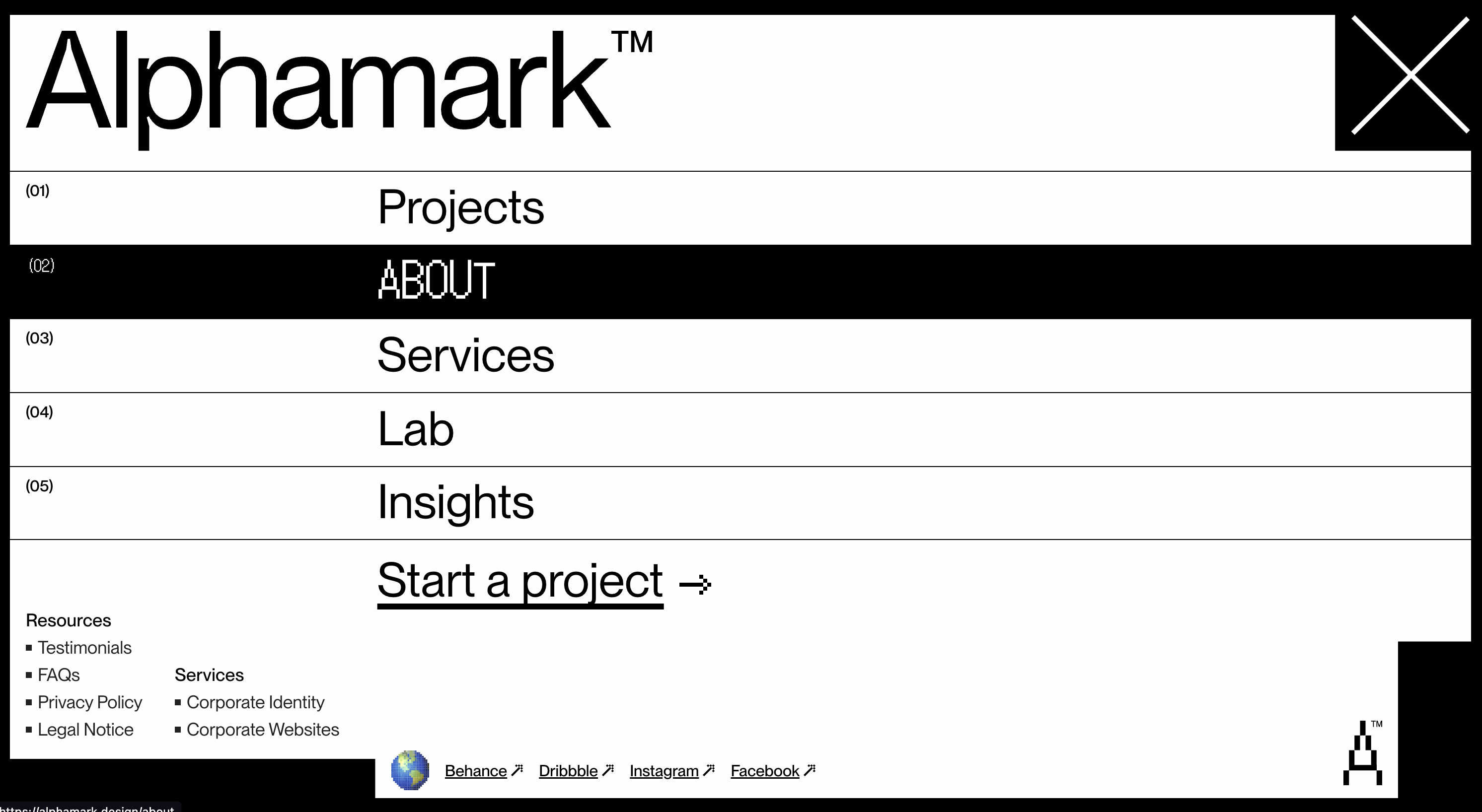 A bold style that gets right to the point, this trend often eliminates supporting copy, colour and even scrolling. In their place is a maxed-out menu with huge typographical navigation links. This extreme take on ‘less is more’ depends on the content being self-explanatory or previously known. A popular use-case is for portfolios and personal sites, where the visitor has come with a purpose – to research a prospective employee. In this way, the trend functions like an interactive, digital business card. Whatever their use, maxed-out menus are not just an opportunity to display beautiful typography – they respect the visitor’s time through barebones efficiency.