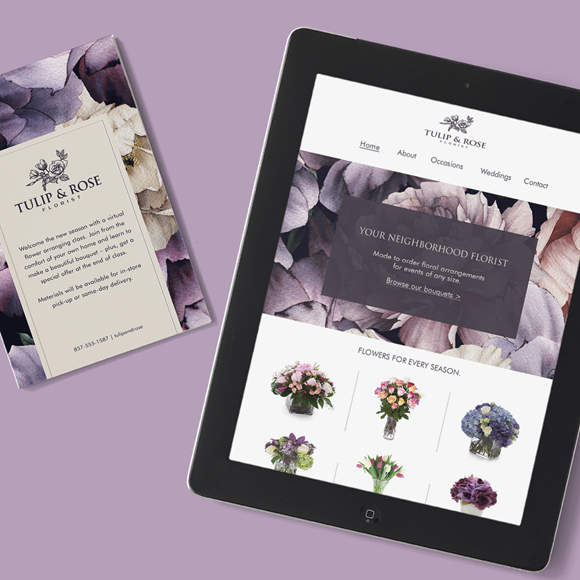Tulip & Rose incorporates shots of their own products (bouquets!) as background images on website pages, business cards, postcards and flyers. Try it for yourself—just make sure the product photo colours are compatible with your brand colour palette.