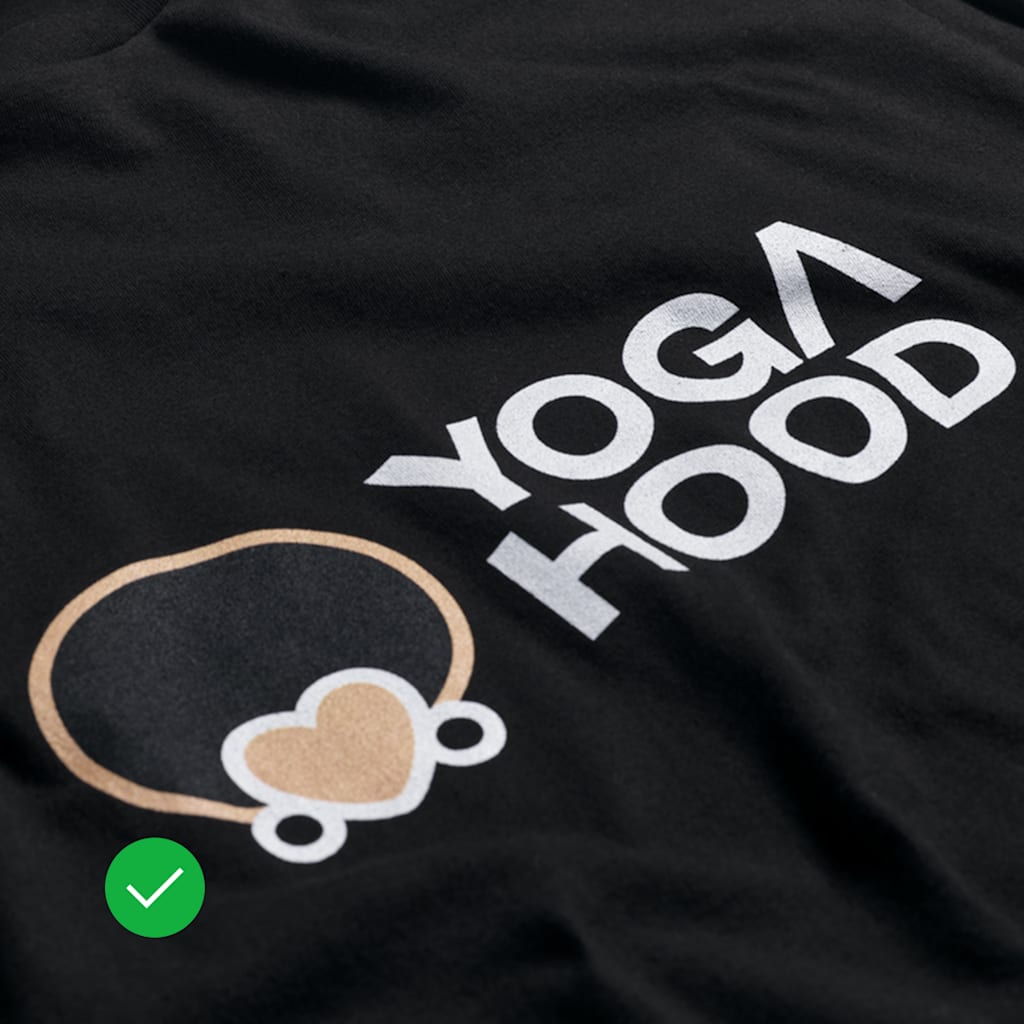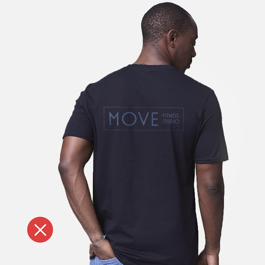 When choosing colours, it’s not all about your favourites — the colours you choose need to be visible on the fabric of your choice. You need colours that feel complementary to each other, meaning that they offer sharp contrast. Naturally, if you want the most contrast, it doesn’t get more striking than white on black (and vice versa). As a general rule, bright colours on a dark background work well for readability… after all, the coolest logo design on earth will disappear if it’s printed in navy on a black tee.