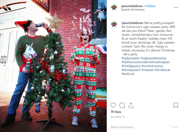 Here’s a Christmas Instagram post from Ipswich Ale Brewery sharing a photo of the business employees repping their ugly Christmas jumpers and announcing a contest at the brewery: