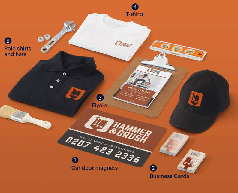 A logo is the key to success for any small business owner. Yours should be recognisable and, ideally, impactful from a distance (or at a glance). If you already have a logo, consider creating a simplified, magnified version that you can use on your on-the-go marketing materials — like Hammer & Brush does here with their polo shirts and hats. These branded items instantly turn your employees and customers into walking adverts.
