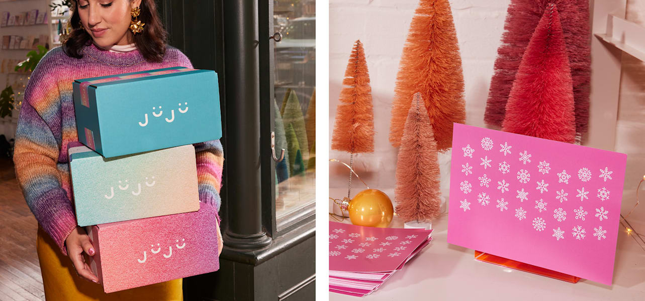 Whether you sell in-store or online, customers appreciate pretty packaging. And if it’s appealing enough, they might even share it in an unboxing video — which means more eyes on you! There are plenty of DIY Christmas ideas for sprucing up your packaging. Kraft paper is an affordable gift-wrapping classic that you can easily adorn with doodles, twine or a few sprigs of winter greenery. For an extra bit of pizzazz, pair it with a silky ribbon in a festive colour or pattern. Or, give your everyday packaging some seasonal flair with a Christmas-ready gift tag or postcard.