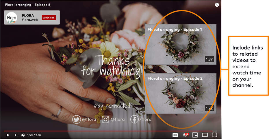 • Cross-promote another channel. This is a great way to collaborate with like-minded content creators! For example, if you’re a florist showing a behind-the-scenes video of your work at a recent wedding, add a link on your end card to the videographer’s full-length wedding video – and ask them to do the same for you.