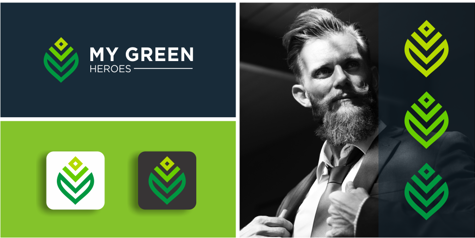 Take, for example, Ezanov’s logo for My Green Heroes. The green shades convey a sense of nature, and the geometric style of the leaf (along with the iPhone photo) show us that the brand is about technology. But it is the way the logo is arranged upright, with the colours transitioning from dark to light, that tells the story of an upward climb against environmental destruction. The photo of a modern man confidently sporting a suit gives us our character, poised to take action.