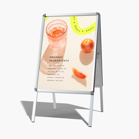 Whether you’re looking for permanent, weather-resistant signage or temporary, portable messaging, VistaPrint has a selection of pavement signs for you to choose from. For example, our waterbase signs are a great option for displaying your business name, opening hours and contact info all year round. Whereas our chalkboard signs are ideal for messages that change on a regular basis, like menus or daily offers. A-Frames make a great choice if you’re promoting your business on the road or at markets and events due to their lightweight and portable frames.